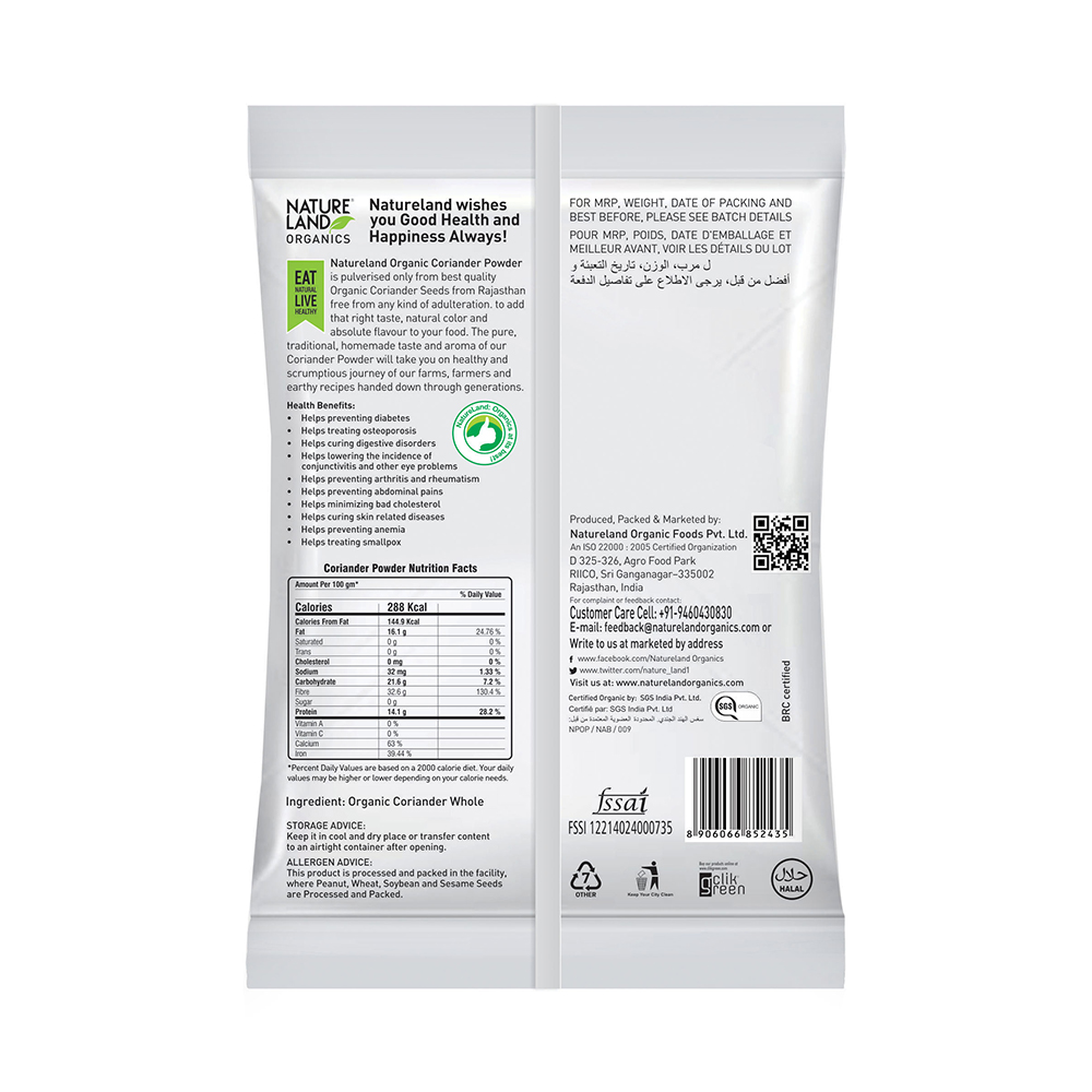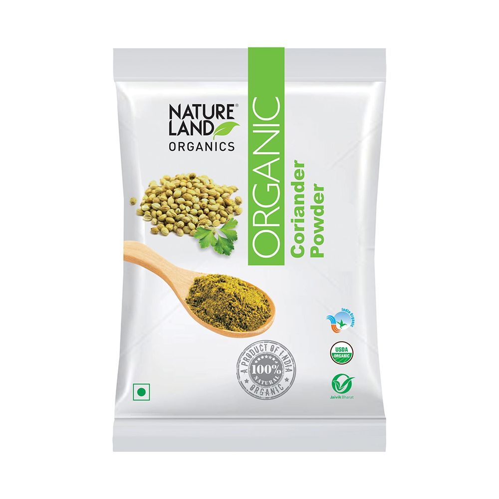 Coriander or cilantro is a wonderful source of? dietary fiber, manganese, iron and? magnesium? as well. In addition, coriander leaves are rich in? Vitamin C, Vitamin K and protein. They also contain small amounts of? calcium,? phosphorous,? potassium, thiamin, niacin and carotene. Natureland’s Organic Coriander powder is pulverized and grinded from best organic coriander seeds in whole form to impart great aroma and taste. Before packing it is cooled and checked for quality to ensure its purity and hygiene.