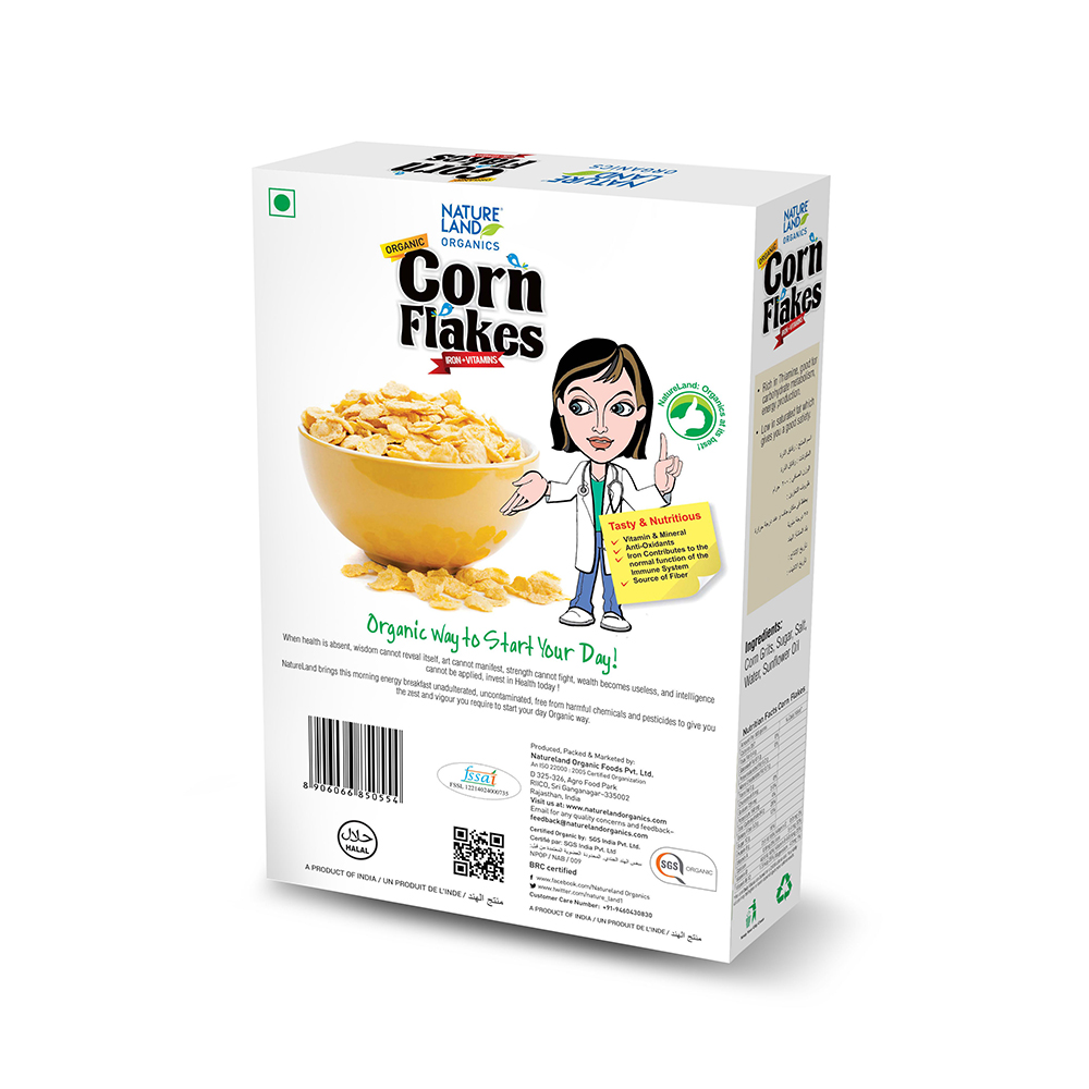 Natureland’s Organic Corn Flakes are a good way to start your day filled with energy it is a good source of Folate, helpful in preventing? birth? defects,? colon? cancer? and? heart? diseases.? It is Very rich in Thiamine, good for carbohydrate metabolism, energy production and cognitive functions, Very low in saturated fat and a gives you a good satiety.? It has no cholesterol. Low cholesterol reduces the risk of heart attacks and heart diseases.? Its high iron content maintains healthy blood levels and helps keep the brain alert.? Corn Flakes provides lutein which is an important nutrient for eye health.